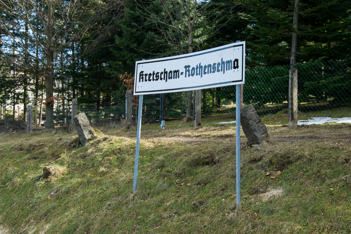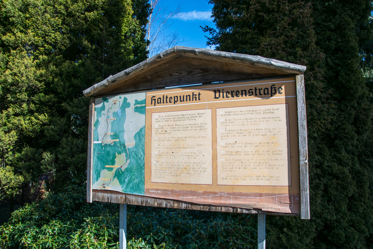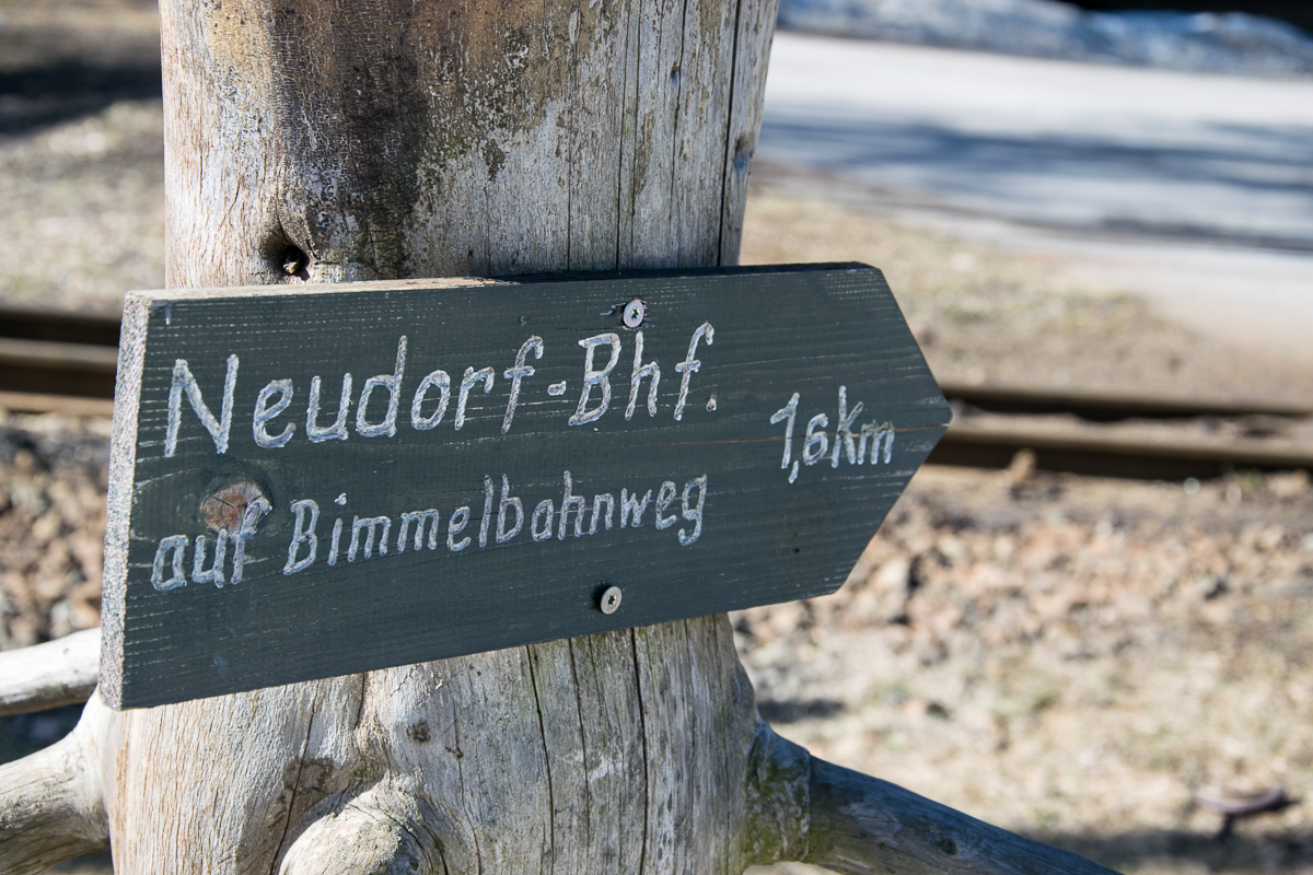 Am Bahnhof Vierenstraße ist es etwas knifflig, da der Erlebnispfad Bimmelbahn Richtung Kretscham-Rothensehma nicht ausgeschildert ist. Da der Weg aber direkt an den Schienen entlang läuft ist der Einstieg aber offensichtlich. Wir gehen in entgegengesetzter Richtung der Ausschilderung „Neudorf Bahnhof“, überqueren die Straße und erreichen einen Weg, der direkt neben den Gleisen verläuft. Nach wenigen Metern überqueren wir die Brücke über die