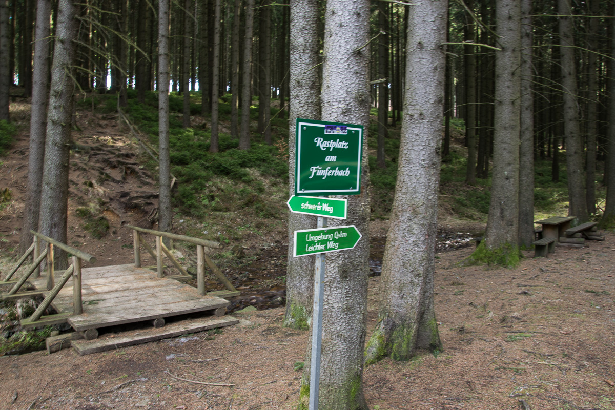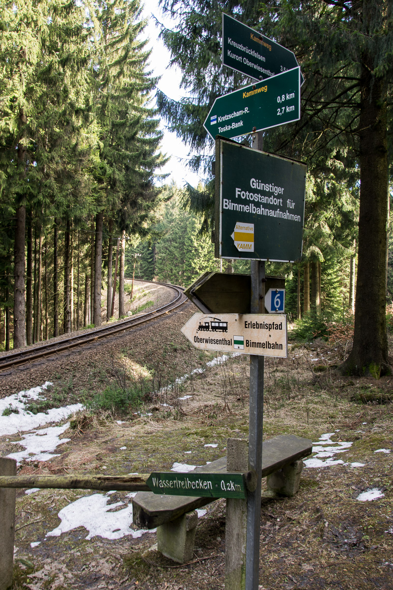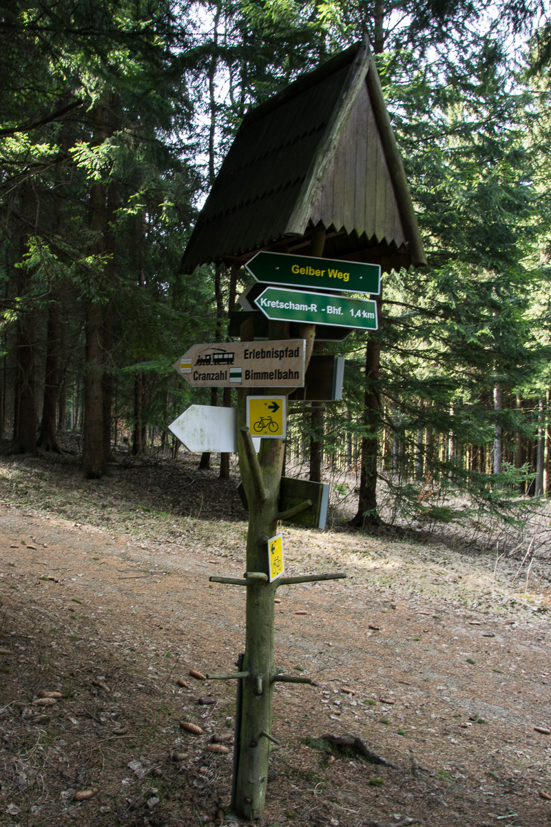 Sehma und halten uns links, um auf dem Weg entlang der Gleise zu bleiben. (Alternativ kann auch der kurze Abstecher nach rechts gewählt werden (Trim-Dich-Pfad), dieser stößt nach einem kurzen Stück wieder auf unseren Weg.) Durch den Wald wandern wir, bis wir an eine Wegkreuzung gelangen, an der wir den Weg geradeaus wählen, der auch als „Erlebnispfad Bimmelbahn“ ausgeschildert ist. Nach wenigen hundert Metern erreichen wir den Rastplatz am Fünferbach. Hier laden ein paar Bänke zu einer Rast ein und der flache Bach ist ein idealer Spielplatz für die Kinder! Mit einem geländegängigen Kinderwagen geht es auf der Umgehung weiter, ohne Kinderwagen können wir den kurzen Weg mit Anstieg und Wurzeln wählen. Am Ende halten wir uns links und erreichen einen kurzen Wegabschnitt, der etwas sonnig ist. Nach wie vor verläuft die Tour entlang der Gleise und wir erreichen die Schutzhütte „An der Bimmelbahn“. Hier lässt es sich gut aushalten und abwarten, bis der nächste Zug vorbeifährt. Nun ist es nur ein kurzes Stück bis zur Abzweigung zum Wassertretbecken, der wir folgen. Es geht über die Gleise und wir erreichen den Rastplatz am Stümpelbach. Vom Rastplatz geht es ein kurzes Stück bergauf und wir wandern nun etwas oberhalb der Schienen entlang zum Bahnhof Kretscham-Rothensehma. Im Laufe dieses Wegabschnittes passieren wir nochmals ein Schild „Günstiger Standort für Bimmelbahnaufnahmen“ – hier lohnt das Warten auf den Zug, denn es lassen sich wirklich schöne Aufnahme der Dampflok machen! Nun ist es nur noch ein kurzes Stück bis wir am Bahnhof die Schienen überqueren und die Rückfahrt nach Oberwiesenthal antreten.