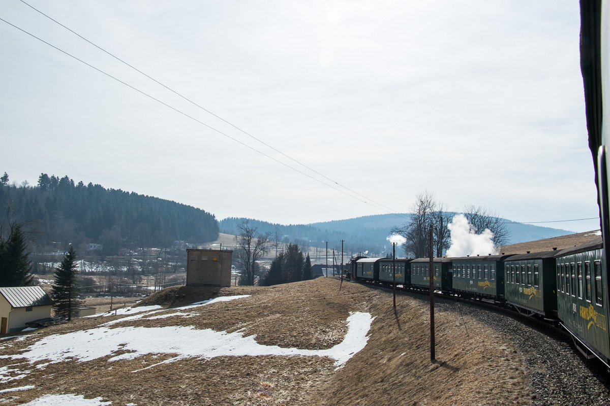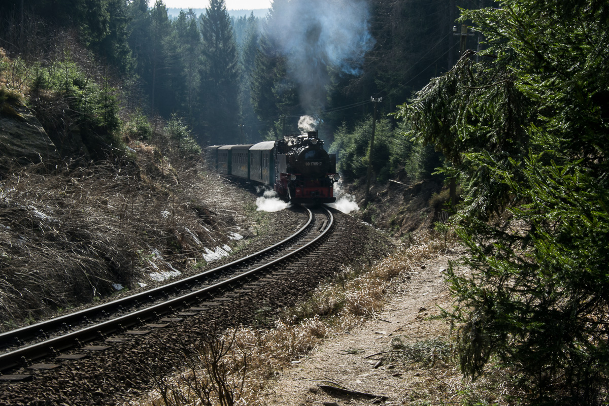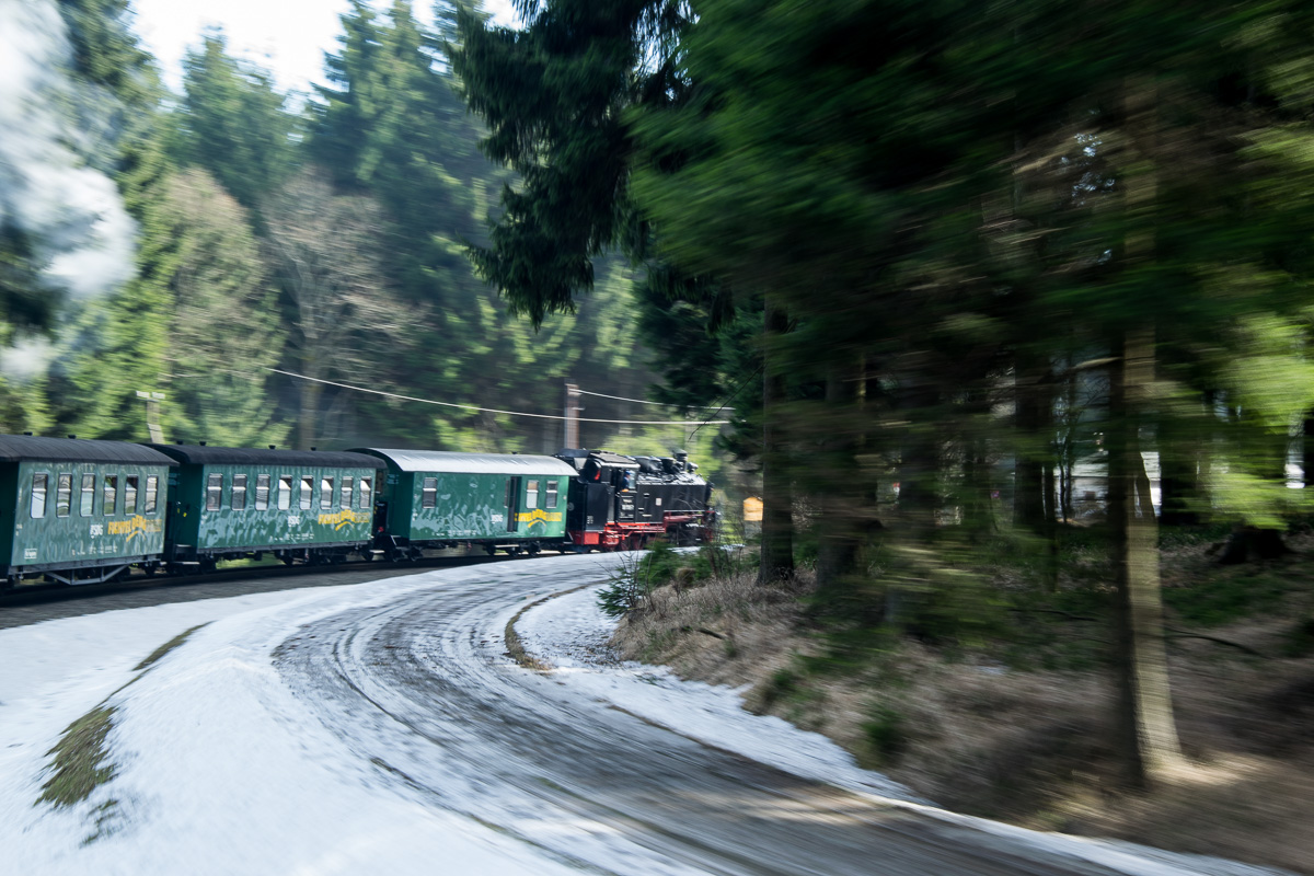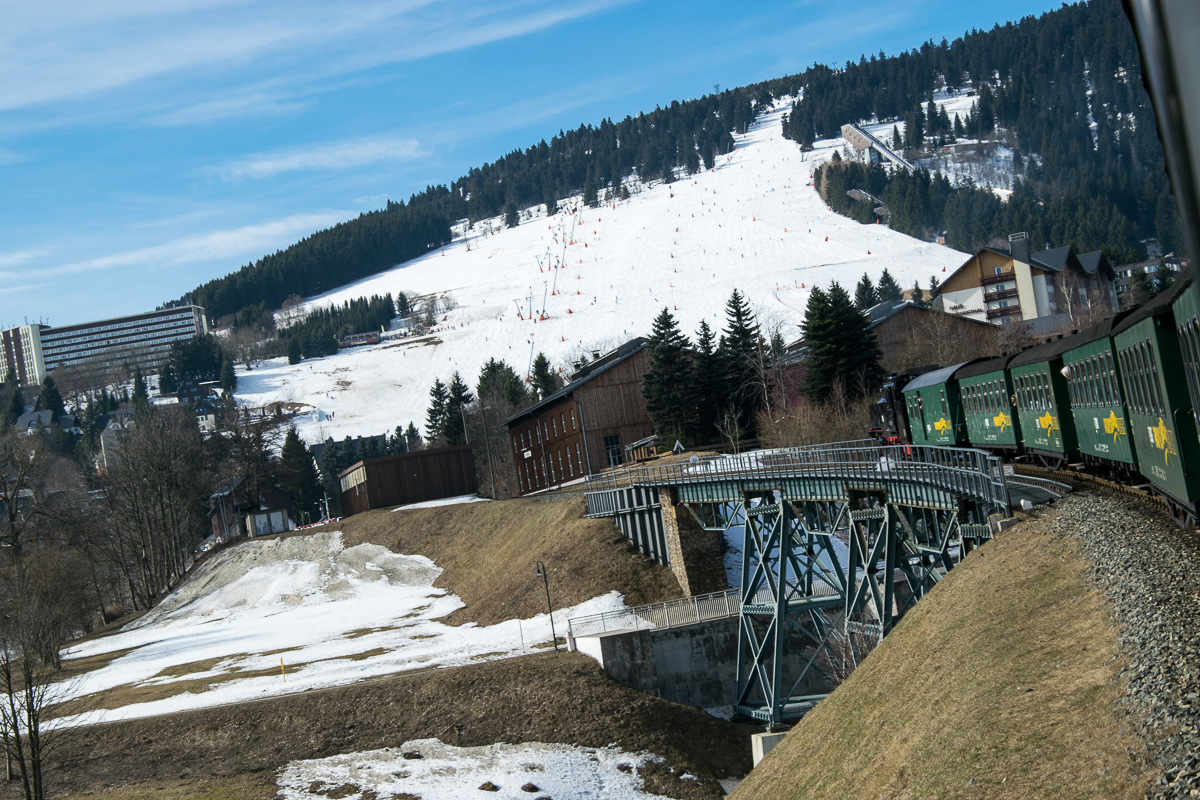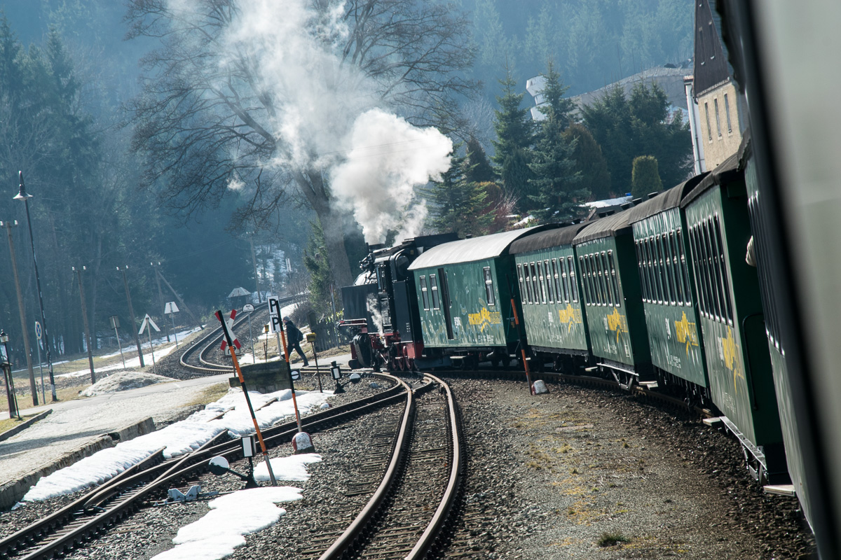 Wir starten unsere Tour am Bahnhof in Oberwiesenthal, wo wir die Dampflok nach Cranzahl besteigen. Ganz gemütlich verlässt der Zug den Bahnhof und überquert eine 23 Meter hohe Stahlgitterbrücke. Mit einer Geschwindigkeit von 25 km/h geht es entlang der Grenze zur Tschechischen Republik zur ersten Station Unterwiesenthal, die nach etwa 1,6 km erreicht wird. Dort erblicken wir einige Alpakas, die auf einer Farm leben. Weiter verläuft die Fahrt entlang von Wiesen nach Hammerunterwiesenthal. Kurz nach dem Bahnhof führt die Strecke in den Wald und erreicht Niederschlag. Hier wird ein kurzer Stop eingelegt und auf den Zug aus der Gegenrichtung gewartet. Nach der kurzen Pause geht die Fahrt weiter durch den Wald und wir kommen uns vor wie in einem Märchenwald. Nach etwa 45 Minuten Fahrzeit erreichen wir die Haltestelle Vierenstraße, an der wir unsere Wanderung starten.